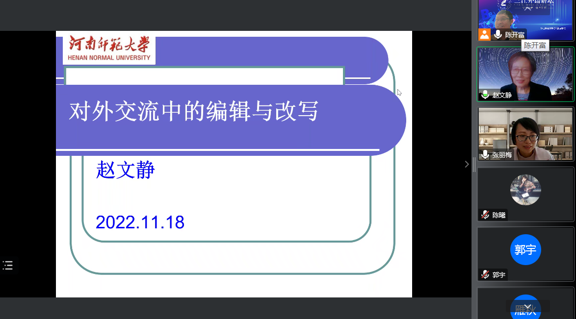 本网讯(文、图/陈开富)11月18日下午,外国语学院第四期“三江外语讲坛”如期举办。本期讲座由学院副院长陈开富主持,主讲嘉宾是河南师范大学赵文静教授。赵文静教授是中国比较文学学会、翻译研究学会理事,首位获得英国翻译学博士的大陆学者。赵教授以“对外交流中的编辑与改写”为题向学院师生呈现了一场高水平学术讲座。