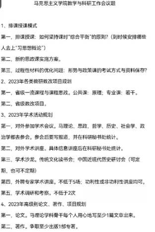 第四项议程是针对2023年高级别论文、专著、项目规划等进行了谋划。学院规划2023年要争取出版专著1部,高学历高职称的老师要力争发表更多高级别期刊论文,要至少组织申报2023年度国家社科基金8项、国家社科基金思政专项2项、四川省社科规划项目3-4项等,同时,老师们要关注教育部及其他中央部委的社科项目。