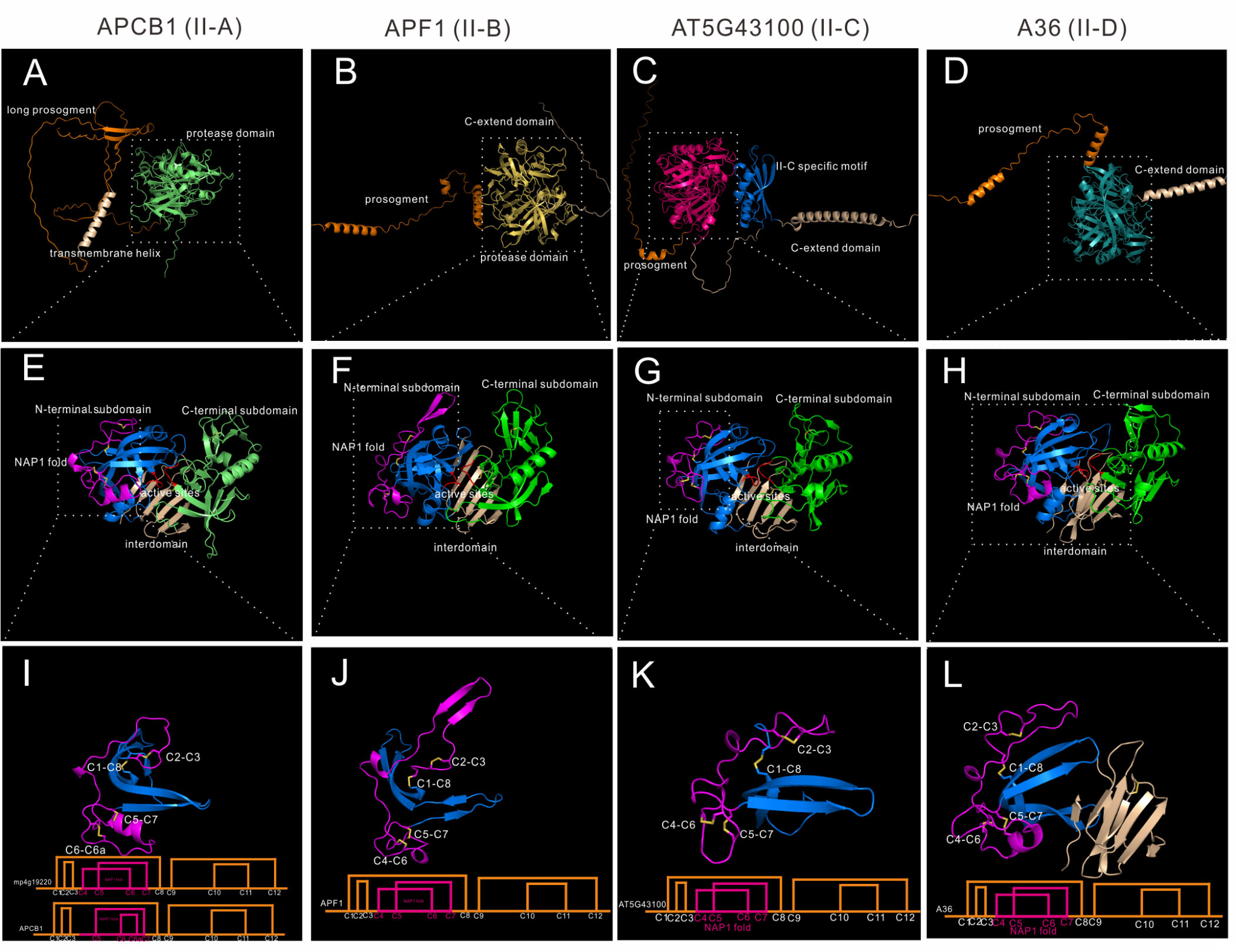 天冬氨酸蛋白酶在植物的生长、发育和防御过程中发挥着重要的作用,因此天冬氨酸蛋白酶家族的分类对于认识其蛋白功能与进化发挥着重要作用。在本研究中,我们创新性的采用AlphaFold预测的高准确性蛋白结构,并结合12个物种的进化关系分析,对拟南芥的70个天冬氨酸蛋白酶成员进行了重新分类。新的分类将天冬氨酸蛋白酶分为4个group,其中group IV是在被子植物中广泛存在的一个特殊group,这一group不具有传统的DTSG和DSGT活性位点,因而在之前的研究中往往被忽视。因此,这一类群的鉴定与分类对于天冬氨酸蛋白酶家族的分类与进化具有重要意义。