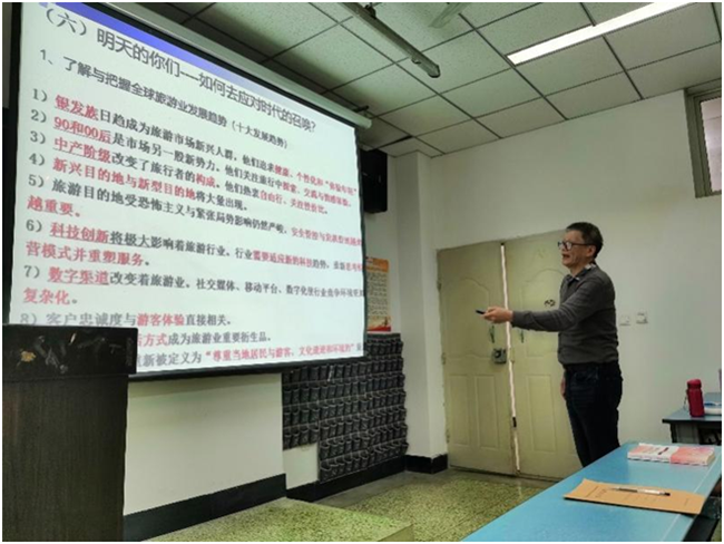 郑教授从旅游的历史、旅游目前的发展态势及面临的困境、旅游的美好未来等三个方面,深入浅出地分析了旅游行业发展情况。郑教授希望同学们要博览群书,不局限于专业,多方面学习研究,全面发展。他说,学习要摆正心态,用心探索,正确认识自身所爱,发现旅游业给人带来快乐的魅力。郑教授将旅游与热门行业(如金融、会计)等进行对比,分析了旅游能使人格局更大、能开阔视野的优势。郑教授在讲座过程中充满激情,真切表达了自己对旅游的热爱与执着,激起了同学们对旅游专业的浓厚兴趣,现场气氛十分活跃。