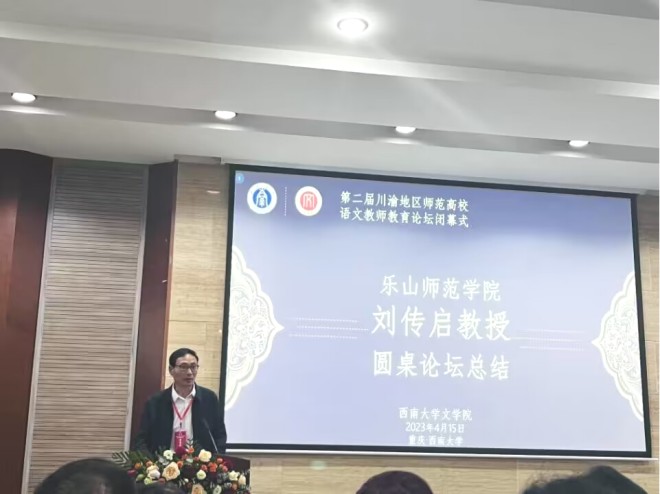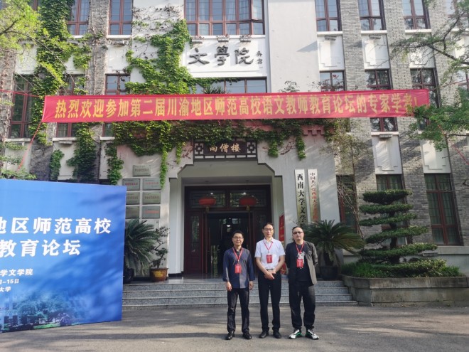 本网讯(文、图/可晓锋)4月14日至16日,文新学院院长刘传启、院长助理张德军、汉语言文学专业教师可晓锋一行应邀参加了在西南大学文学院召开的“第二届川渝地区师范高校语文教师教育论坛”,与西南大学、重庆师范大学、四川师范大学、西华师范大学、内江师范学院、成都师范学院、四川文理学院、重庆文理学院等15所高校,以及重庆教科院、高等教育出版社、重庆南开中学的46位专家学者进行交流。