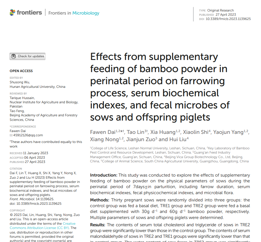 本网讯(文、图/黄霞)近日,我校生命科学学院竹类资源开发团队代发文副教授课题组以乐山师范学院/竹类病虫防控与资源开发四川省重点实验室为第一单位,在国际权威学术期刊Frontiers in Microbiology(JCR1区,6.064)在线发表了题为“Effects from Supplementary Feeding of Bamboo Powder in Perinatal Period on Farrowing Process, Serum Biochemical Indexes, and Fecal Microbes of Sows and Offspring Piglets”的研究论文(论文链接:https://www.frontiersin.org/articles/10.3389/fmicb.2023.1139625 )。该研究揭示了母猪围产期补饲适量精制竹粉可以改善母猪氧化应激损伤和便秘,从母仔一体化角度调控后代乳仔猪粪便微生物组成,减少条件性治病梭杆菌丰度。该论文第一作者和通讯作者为代发文,受到了四川省重点科技计划项目(2021YFN0106)和乐山师范学院人才引进项目(RC202004)的资助。