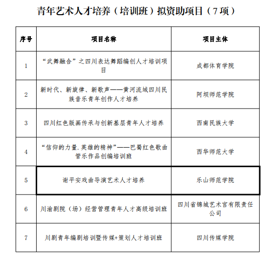 本网讯(文、图/吴洋)近日,四川省文化和旅游厅公布了2023年度四川省艺术基金拟资助项目名单,我校音乐学院周特古斯教授申报的“谢平安戏曲导演艺术人才培养”获得青年艺术人才培养(培训班)拟资助项目(拟资助50万元)。该项目主要与乐山地方经济、社会、文化发展相结合为背景,以我校“谢平安艺术研究中心”为依托,研究谢平安戏曲导演艺术和人才培养的相关问题。该项目得到乐山市文旅局、乐山市文化发展研究中心、乐山市川剧艺术研究院等单位的大力支持。该项目是我校首次获得四川艺术基金项目的立项,是我校在艺术人才培养项目中取得的历史性突破和标志性成果。