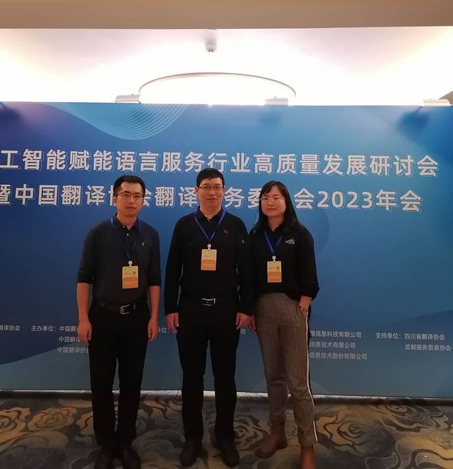 本网讯(文 车欢欢/图 王林)11月3日,应外国语学院翻译实训基地——四川语言桥信息技术公司的邀请,外国语学院副院长陈开富、应用英语系主任王林和翻译专业教师车欢欢赴成都参加了由中国翻译协会翻译服务委员会、翻译技术委员会以及本地化服务委员会联合主办的人工智能赋能语言服务行业高质量发展研讨会暨翻译服务委员会2023年会。