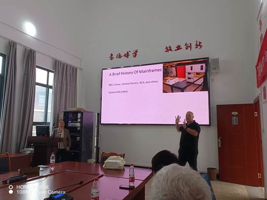 本网讯(文/黄陈英 图/狄红霞、李美莹、曾月霞)2023年11月10日上午10点,受电子信息与人工智能学院金澎院长邀请,美国Timothy J. Slate先生来乐山师范学院电子信息与人工智能学院开展名为《Mainframes: Dying Dinosaurs or Evolving Epics?》的学术讲座。该讲座在特教C栋501举行。本次讲座由徐美莲博士主持,参加讲座的有电子信息与人工智能学院党委书记蒋强、法国院士弗朗什孔泰大学Patrick教授、Eve教授等。参加讲座的还有互联网自然语言智能处理四川省高等学校重点实验室、川西南空间效应探测与应用四川省高等学校重点实验室的老师以及学生工作辅导员狄红霞、雷雄锴等。电子信息与人工智能学院计算机专业21级的学生60余人参加了此次讲座。