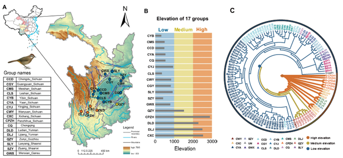 四川盆地环绕着群山,形成了典型的陆地岛屿,呈现出显著的环境差异,导致地理隔离和鸟类种群的遗传分化。该研究选取了中国西南地区的17个白颊噪鹛群体,共包含140个个体作为研究对象,探讨了四川盆地及周边山脉在其遗传分化过程中所发挥的作用。通过整合简化基因组、地理和生态数据,基于群体基因组学分析(种群结构分析、主成分分析、系统发育关系构建、基因流分析)、IBD、IBE、PCA、LFMM等模型,发现这17个群体存在明显的遗传分化,在遗传结构上分为高、中、低海拔群体;地理距离和关键生态因素(海拔和关键气候变量)在塑造这一分化格局中发挥关键作用,且ADCY9基因及其相关代谢通路是推动高海拔群体生态适应的关键因素。同时,冰期气候变化促进了四川盆地及周边山脉群体间的基因流。这一研究结果揭示了四川盆地陆地岛屿效应对白颊噪鹛的影响,有望为鸟类物种以及其他脊椎动物陆地岛屿效应的研究提供新见解。