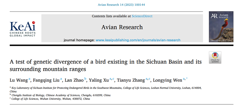 本网讯(文、图/王璐)近日,生命科学学院“西南山地濒危鸟类保护四川省高等院校重点实验室”最新研究成果“A test of genetic divergence of a bird existing in the Sichuan Basin and its surrounding mountain ranges”,在国际知名学术期刊《Avian Research》(JCR一区期刊)在线发表。论文链接:https://doi.org/10.1016/j.avrs.2023.100144。本实验青年教师王璐博士为该成果的第一作者,文陇英教授为通讯作者,本实验室教师刘方庆、武汉大学在读联合研究生张天宇和许亚玲、成都生物研究所副研究员赵兰为共同作者。该成果先后得到了国家自然科学基金面上项目(31372171)和乐山师范学院基金(205210094, ZZ201805)等多个项目资助。