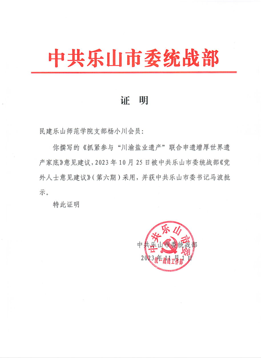 杨小川教授是民建乐山市委副主委、乐山市政协委员、乐山市纪委监委特约监察员。据了解,在该建议案中,杨小川教授针对乐山得天独厚的盐业资源、独具特色的盐业文化遗产,联系“川渝盐业遗产”联合申报现状,提出了建立专班主动争取“川渝盐业遗产”联合申遗、建立盐业文化资源宣传平台打造乐山盐文化品牌和加快推进文旅项目建设擦亮五通桥区盐城文化名片三个方面的建议。