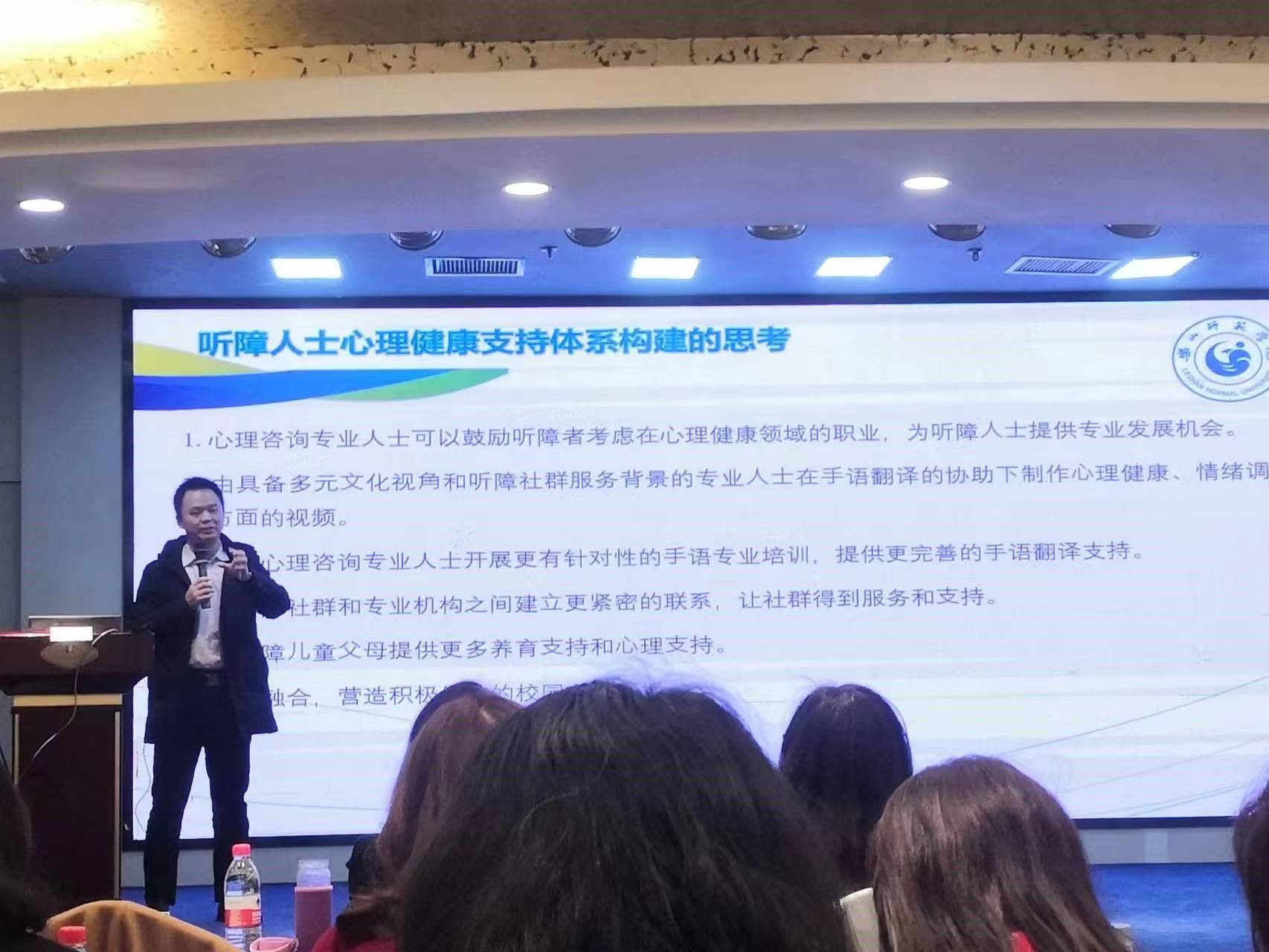 下午,“危机干预与创伤心理治疗专委会”“家庭教育专业委员会”与“精神分析专委会”分会分别举办分论坛。我校教师张嘉江参加了“危机干预与创伤心理治疗专委会”并做了题为“共建无障碍心理健康支持体系——听障大学生心理危机的预防与响应策略”的主题报告,详细介绍了我校在开展听障大学生心理健康教育与危机干预的做法和经验,特别分享以“以构建残健融合、多样包容、尊重信任的校园环境,提升听障学生心理健康水平”为目标的四级危机预防机制、团体心理活动、建设心理健康教育可视化资源库,以及艺术健心、体育健心、德育健心的具体做法,同时,对当前听障大学生心理健康服务存在的问题,如评估工具适用性差、无障碍支持缺位、沟通障碍,以及对未来如何构建听障人士心理健康支持体系,提出了自己的思考,如心理咨询专业人士可以鼓励听障者考虑在心理健康领域的职业,敦促专业协会关注为听障人士提供专业发展机会,面向心理咨询专业人士开展更有针对性的手语专业培训,残健融人士合,营造积极健康的校园文化环境,积极推进听障人士心理健康评估工具的开发研究,培养会手语的朋辈心理辅导员等。