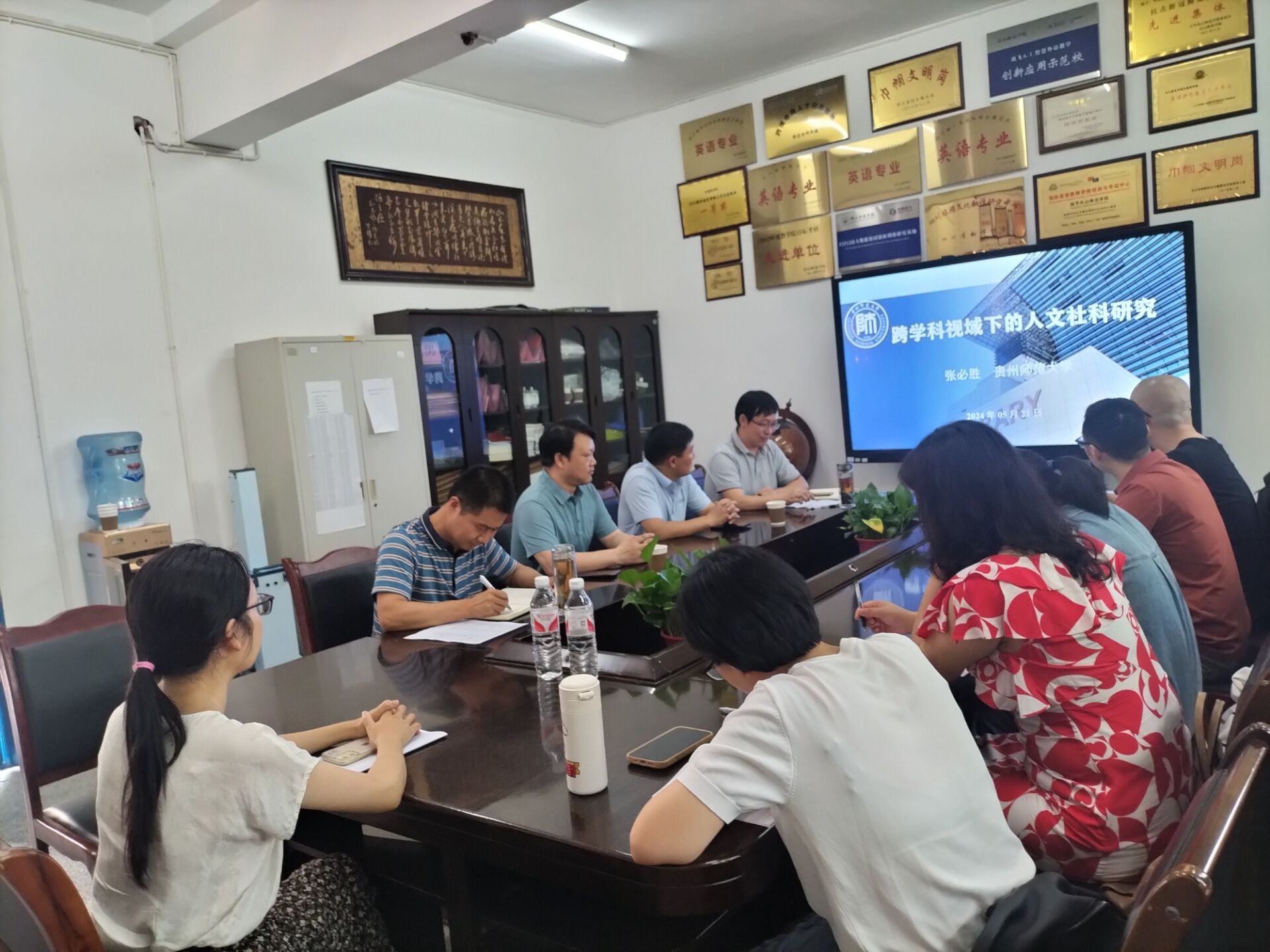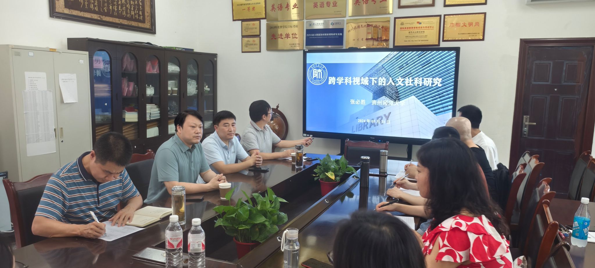 本网讯(文/景爱民 图/雷洪敏)5月21日下午,外国语学院在学院三楼会议室举办了“社科活动月”第四场学术讲座“跨学科视域下的人文社科研究”。本场讲座由外国语学院副院长陈开富主持,贵州师范大学张必胜教授受邀主讲,学院副院长徐波及专任教师代表参加了本次学术讲座。