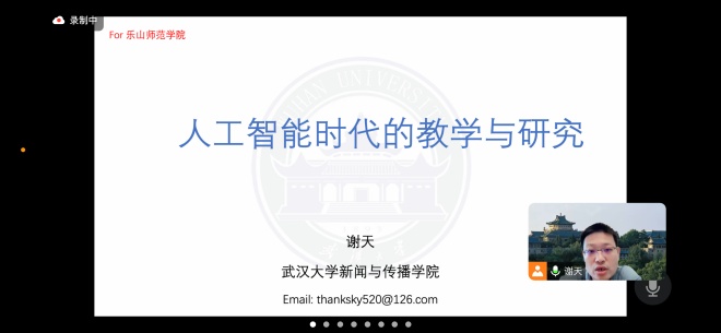 本网讯(文/图/孙立青)6月20日上午10点,武汉大学新闻与传播学院谢天副教授通过线上平台为文新学院院师生带来一场题为“人工智能(AI)如何辅助教学与科研”的精彩讲座。讲座由副院长杨晓军主持,吸引了众多教师及22级网络与新媒体专业学生的积极参与。