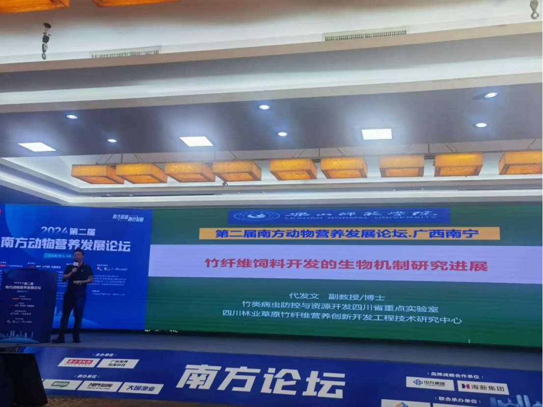本网讯(文、图/黄霞)7月14日至16日,由南方报业传媒集团南方农村报、广州饲界知库科技主办的2024第二届南方动物营养发展论坛在广西南宁隆重举办。作为南方地区规模最大、规格最高、阵容最强的动物营养领域大会,本届南方论坛由中国工程院李德发院士和麦康森院士领衔,国内动物营养领域顶尖专家、行业领袖、企业代表、一线精英等近700人出席会议,探讨动物营养行业高质量发展。生命科学学院副院长、四川林业草原竹纤维营养创新开发工程技术研究中心主任代发文受邀参加了此次会议,并做《竹纤维饲料开发的生物机制研究进展》的主题报告。