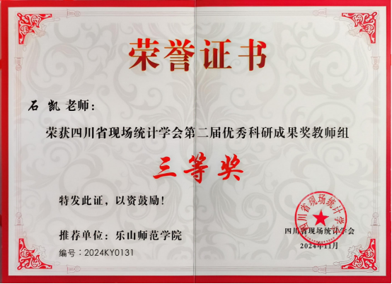 会议期间,我校教师代表石凯荣获了“四川省现场统计学会第二届优秀科研成果奖教师组”三等奖的表彰。