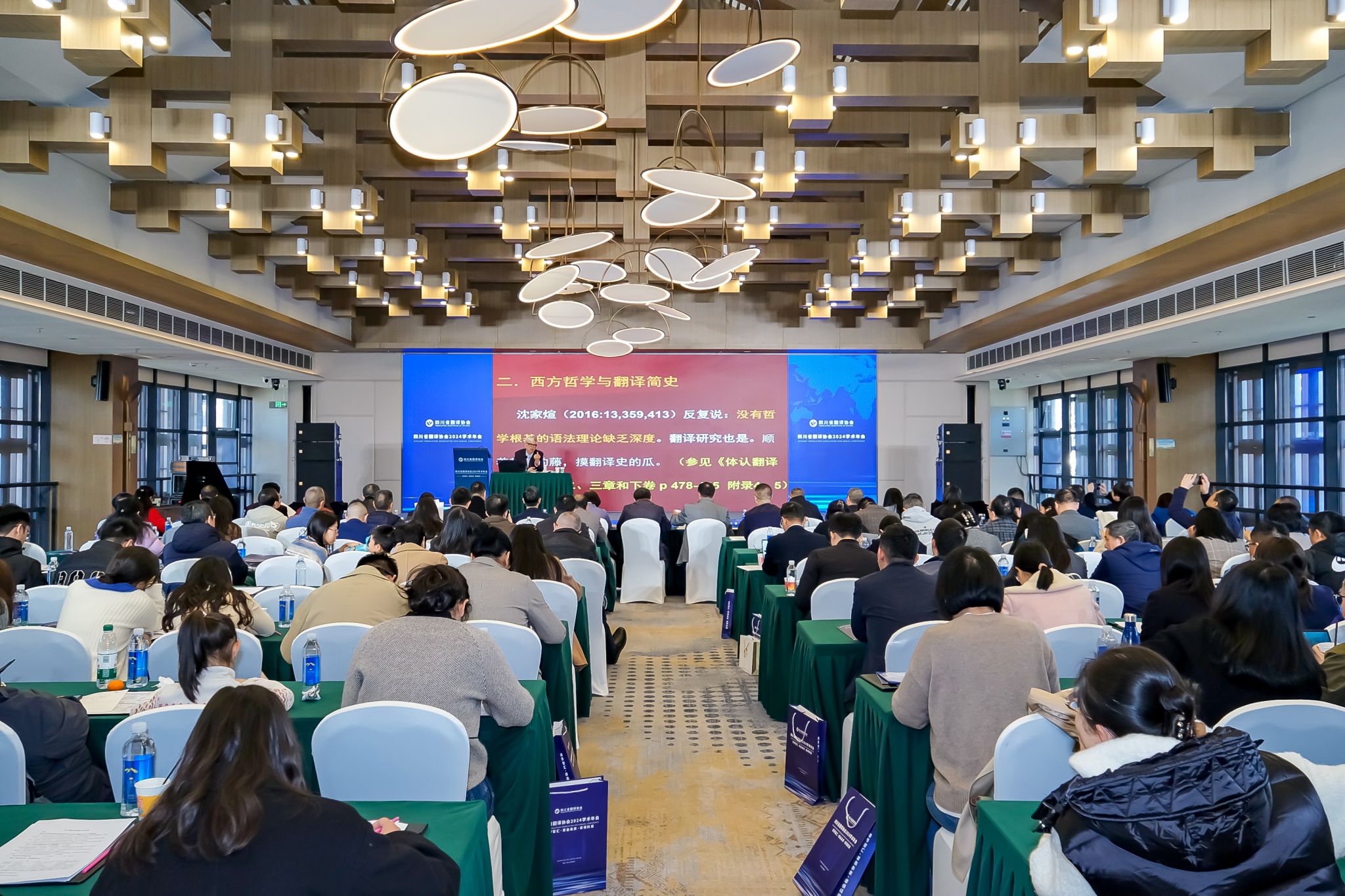此次学术年会共分为三个阶段。第一阶段为理事/常务理事会,四川省翻译协会会长李志民回顾了2024年理事会工作情况,分析了存在的问题并对协会相关变动做情况说明。王林就省译协入驻外国语学院的旅游文化翻译研究中心工作情况作交流发言,重点汇报了外国语学院与乐山市文化广播电视和旅游局共建乐山市文旅国际化传播研究中心的情况。第二阶段为大会暨颁奖仪式。李志民作年度工作报告,回顾了2024年协会亮点工作,并指出了存在的问题。大会宣布了天府翻译奖、科技翻译成果奖和协会优秀工作者的获奖情况。第三阶段为专家报告与分组发言。四川外国语大学王寅教授作了题为“体认翻译学的理论与实践”的专家报告,从哲学的高度新解了翻译的功能与担当;暨南大学赵友斌教授作了题为“中华学术外译等翻译类相关课题的准备与申报”的专家报告,结合自己的申报经历和评审感悟提出了相关的建议和意见。随后,学术与交流工作委员会与科技翻译工作委员会共组织了多场分组发言,涵盖翻译与国际传播、科技翻译、翻译技术与人工智能、翻译教学、语言服务与行业发展等,让与会者受益匪浅,享受翻译研究、翻译实践、翻译教学和翻译行业的饕鬄盛宴。会议期间,王林与省内兄弟院校翻译专业和MTI负责人及语言服务企业参会代表就翻译人才培养与翻译专硕建设等进行了深入交流。
