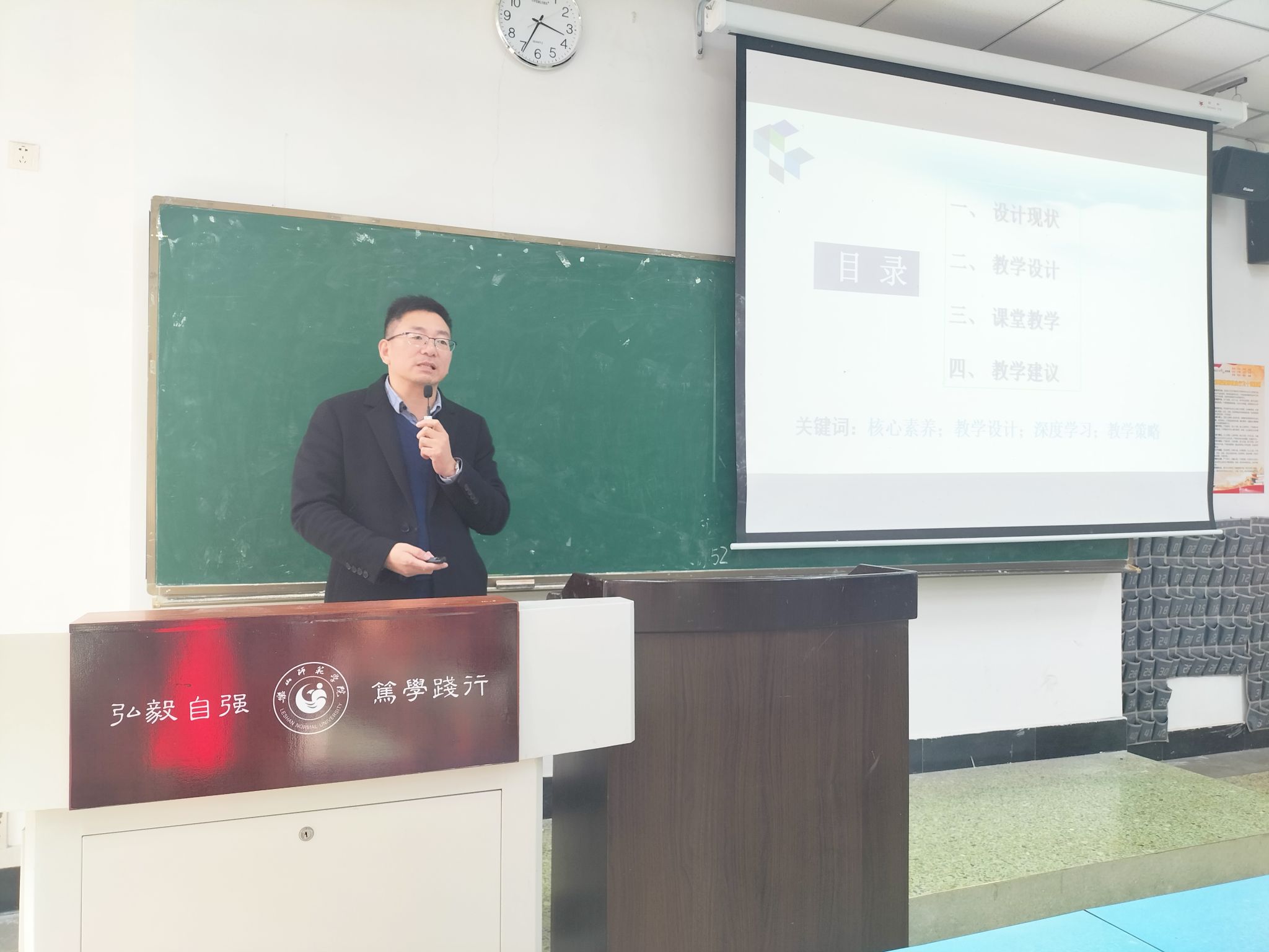 江世勇代表学院致欢迎辞。讲座中李兴勇博士从设计现状、教学设计、课堂教学和教学建议四个方面详细讲解了在核心素养教育时代高中英语教学设计不提倡碎片化的聚焦语言知识和语言技能的教学;教学设计和实施需要基于语篇情景,以知识与技能为学习内容,以思维认知发展为层次推进,以交流互动学习为方式,以文化内涵学习为核心,以主题意义探究为主线开展教学。学院副院长徐波对本次讲座做了总结。最后,李兴勇博士对与会学生提出的问题给予了详尽解答。