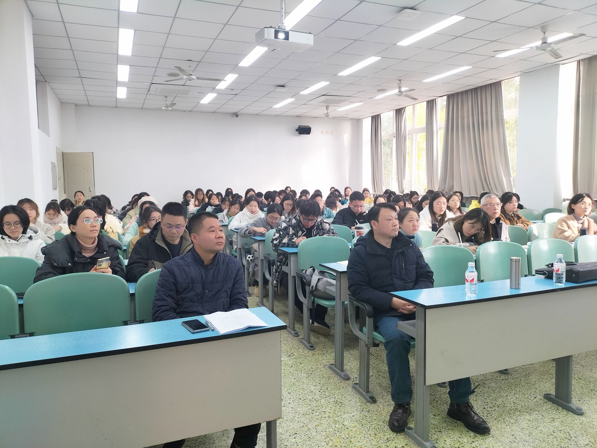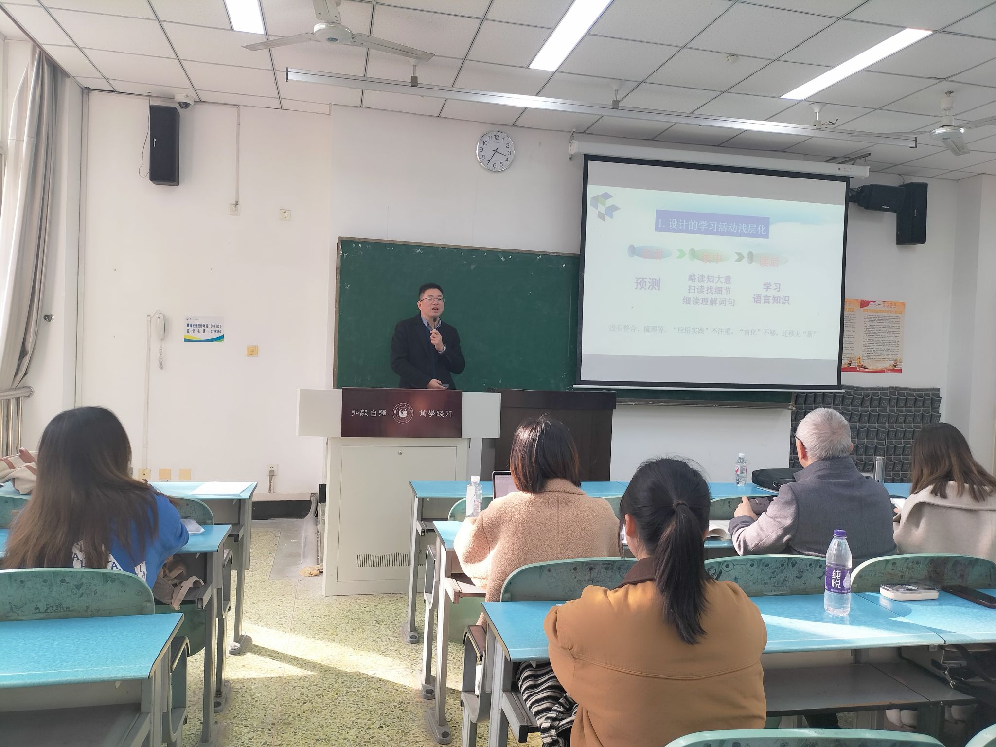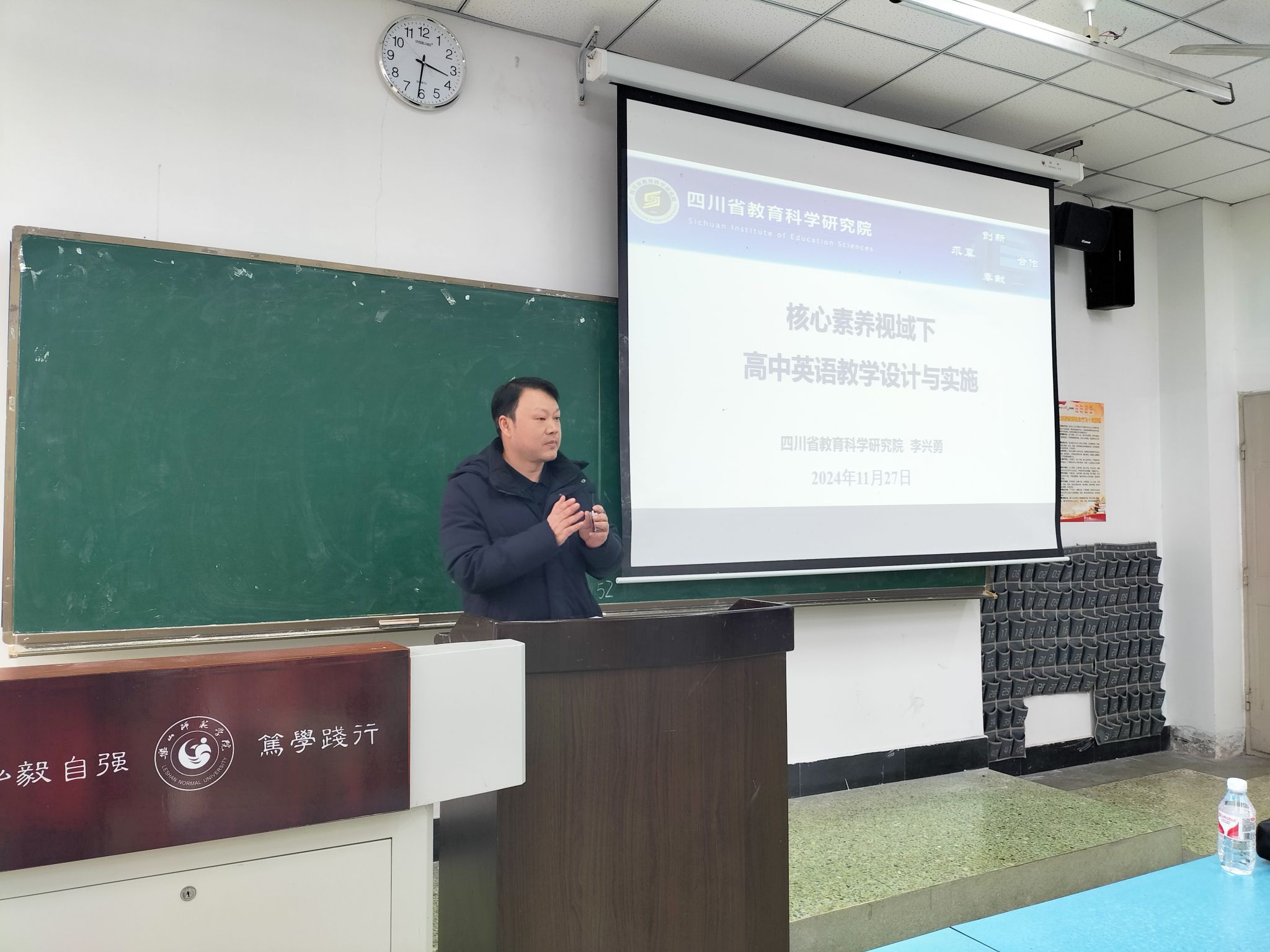 本网讯(文图/景爱民)11月28日下午,外国语学院在行知楼111室举办了学术讲座“核心素养视域下的高中英语教学设计与实施”。本场讲座由外国语学院院长江世勇主持,四川省教育科学研究院基础教育研究所副所长李兴勇博士受邀主讲,外国语学院副院长徐波、学科英语团队骨干教师、22级和23级英本班全体学生参加了本次学术讲座。