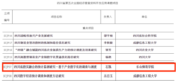 本网讯(文、图/罗世超)12月6日,根据《四川省第五次全国经济普查资料开发应用计划》安排,四川省第五次全国经济普查领导小组办公室组织专家对申报课题开展评审,四川省统计局发布了“四川省第五次全国经济普查资料开发应用课题立项”的公告,(https://tjj.sc.gov.cn/scstjj/c105843/2024/12/6/91ccfc12bdd64c10a64c58c72fcae088.shtml)确定《四川新质生产力发展研究》等15项重大课题和《四川战略性新兴产业发展研究》等30项重点课题为四川省第五次全国经济普查资料开发应用课题,我校数理学院石凯老师申报的课题《四川省数实融合的统计监测研究—基于产业数字化的调查与测度》荣获重点项目立项,资助经费5万元,实现了数理学院在省级统计类科研课题重点项目申报上的突破!