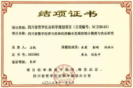 石凯,2020年博士毕业于西南财经大学统计学专业,现担任数理学院应用统计学专业负责人和教研室主任。2022年6月至2023年11月主持完成了四川省社会科学“十四五”规划项目《四川省数字经济与实体经济融合发展的统计测度与实证研究》,结题评价等级“良好”。本次项目的申报是对前期课题研究的拓展和深化,以当前热点的“数字经济”为对象,立足四川省区域,提出“数实融合的统计监测研究”的主题,拟从统计理论、实践、分析和应用等多维层次开展系统的研究。
