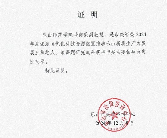 本网讯(文/李安然,图/陈果)近日,经济管理学院副教授马向荣博士执笔的咨政报告《优化科技资源配置推动乐山新质生产力发展》获市委主要领导肯定性批示。