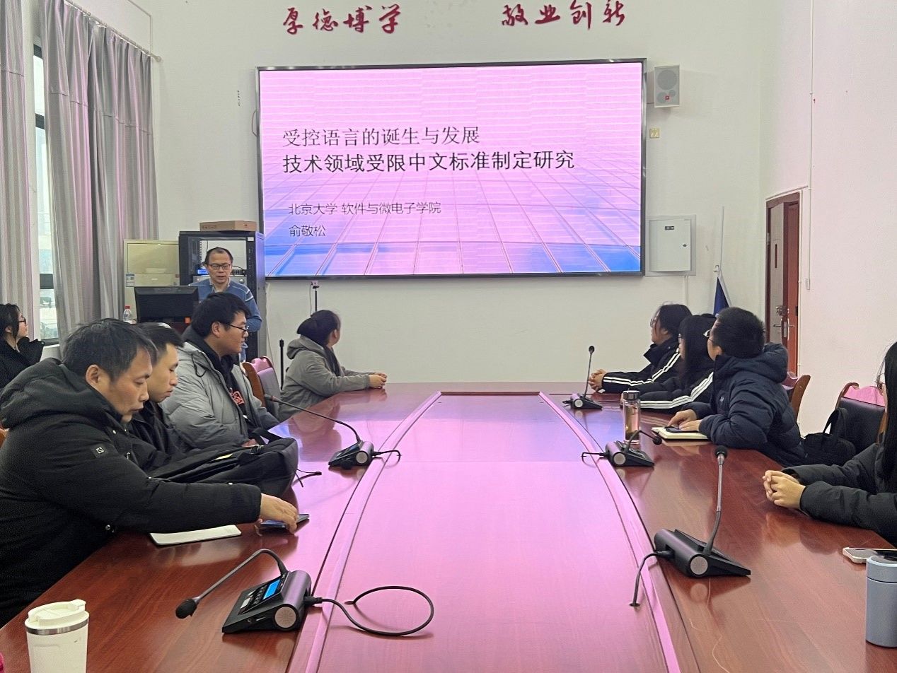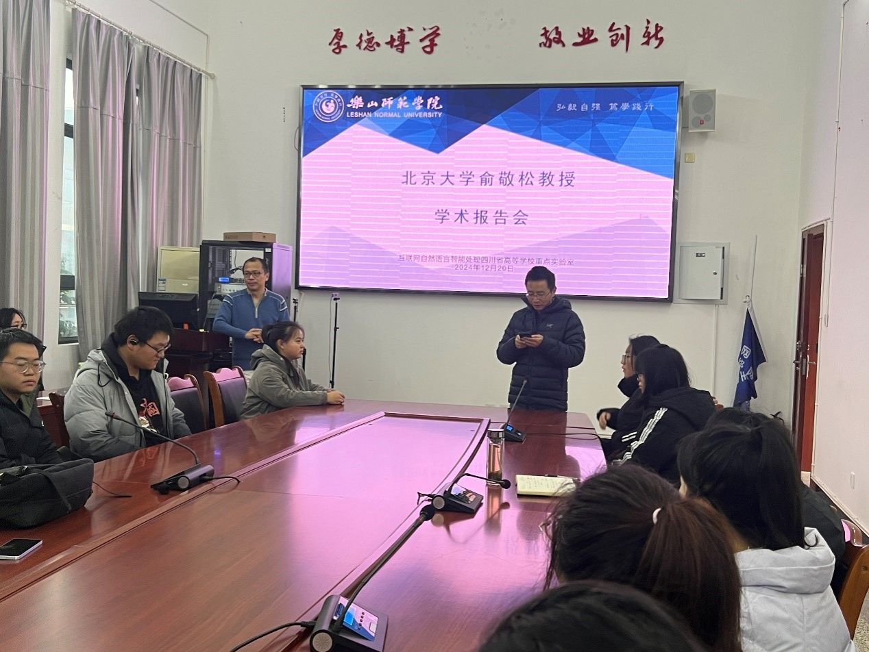 本网讯 (文/黄陈英、图/苟钰)2024年12月20日上午,北京大学俞敬松教授受电子信息与人工智能学院金澎院长邀请,来乐山师范学院开展学术讲座,讲座题目为《受控语言介绍与受限中文研究》。电子信息与人工智能学院师生和文学与新闻学院师生80多人参加了本次学术讲座。参加本次讲座的还有部分西南石油大学研究生和成都信息工程大学研究生,金澎院长主持了本次讲座。