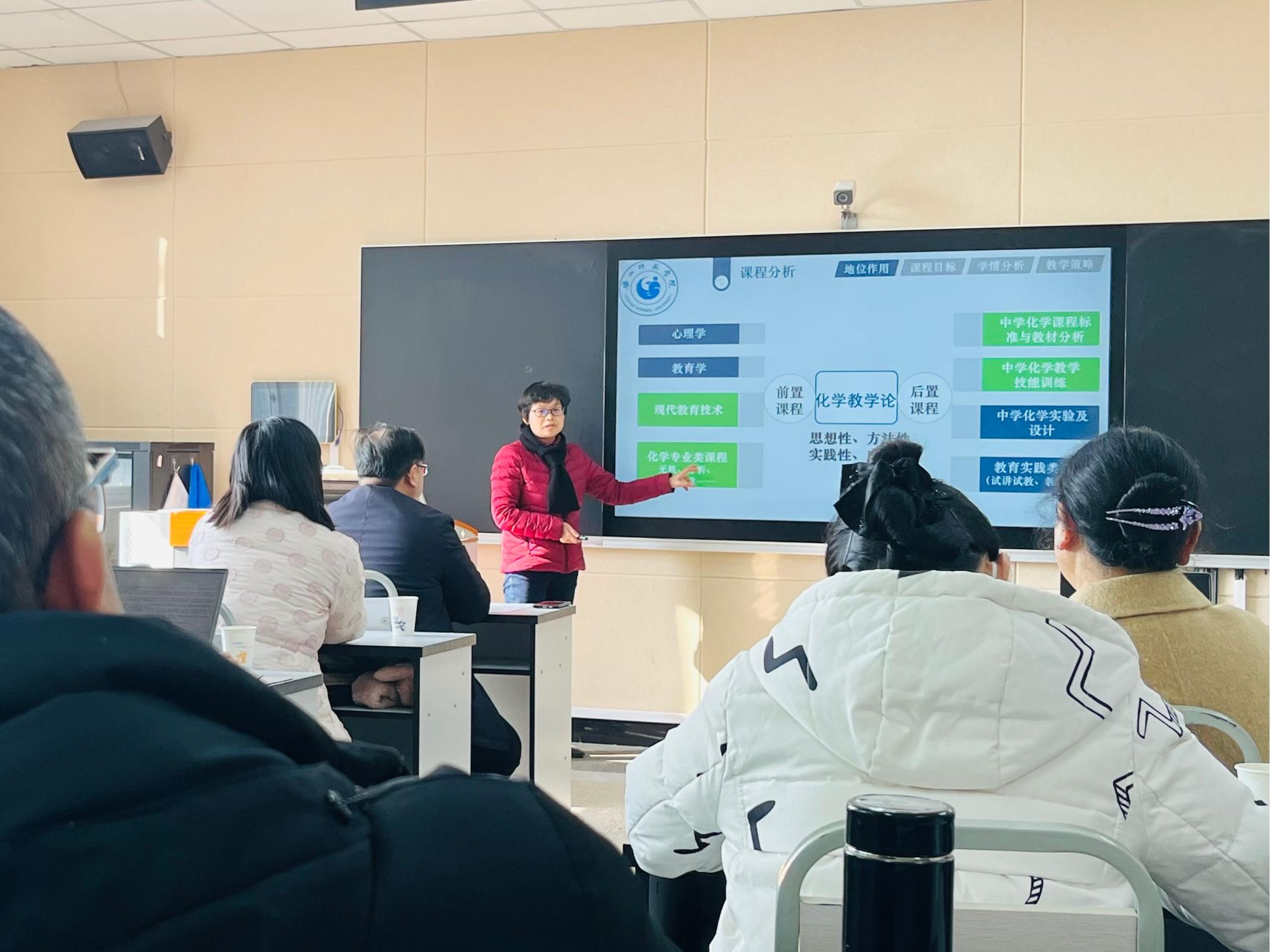 张海连老师以《化学教学论》课程为例作了教学创新汇报。她从课程分析、课程实施、课程评价与效果、课程特色、改进方向五个方面进行了阐述。她结合基础教育新课标、新高考等基础教育改革动态,厘清了《化学教学论》课程在化学师范生人才培育体系中的位置,进而调整了课程教学目标。针对当前课程教学存在的问题,她在课程实施中增加主题式的课前预习、课后训练,以强化学生教研能力。新举措在实践层面取得了显著成效,为课程的改革和发展提供了宝贵的借鉴和经验。
