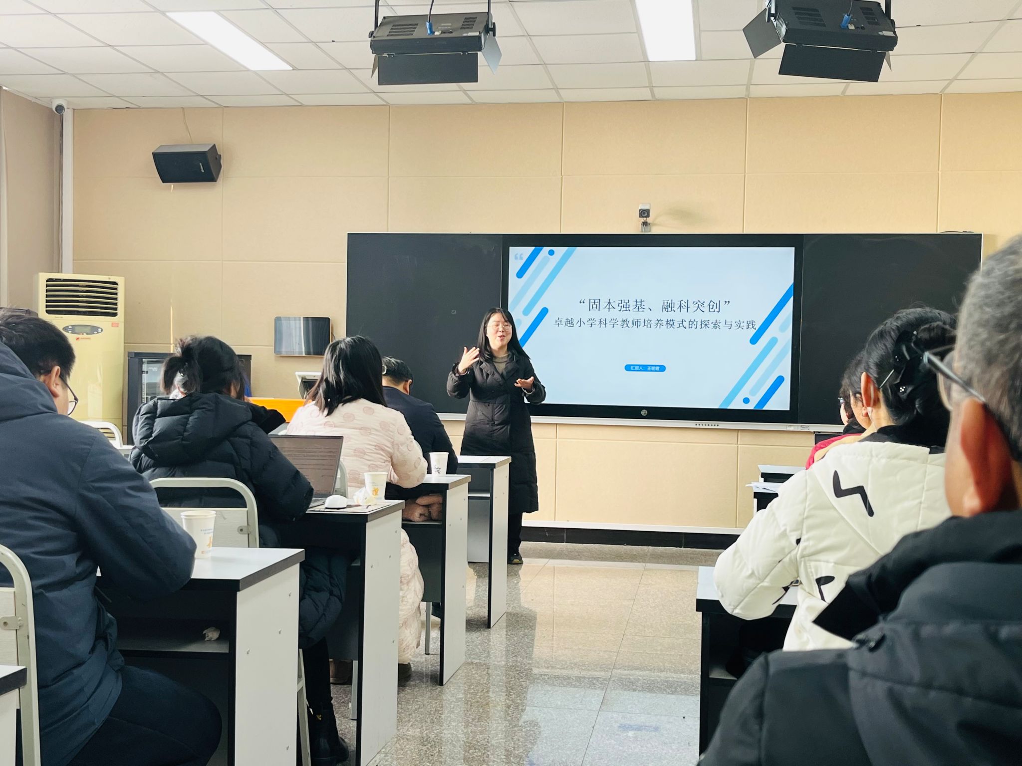 王朝君老师以“固本强基、融科突创:卓越小学科学教师培养模式的探索与实践”为题,分享了她在科教专业推行项目式学习、整合资源平台的举措,产出了丰硕的教学、教研成果。针对大学生科学精神欠缺、创新素养欠佳、科教能力不足等问题,她提出了“科学史-科学家-科技馆”三线并行的育人方法,厚植科学精神;“基础-拓展-交互-产出”四环一体育人策略,培育创新素养;“见习-创习-实习-研习”四习一贯育人路径,增强施教能力。