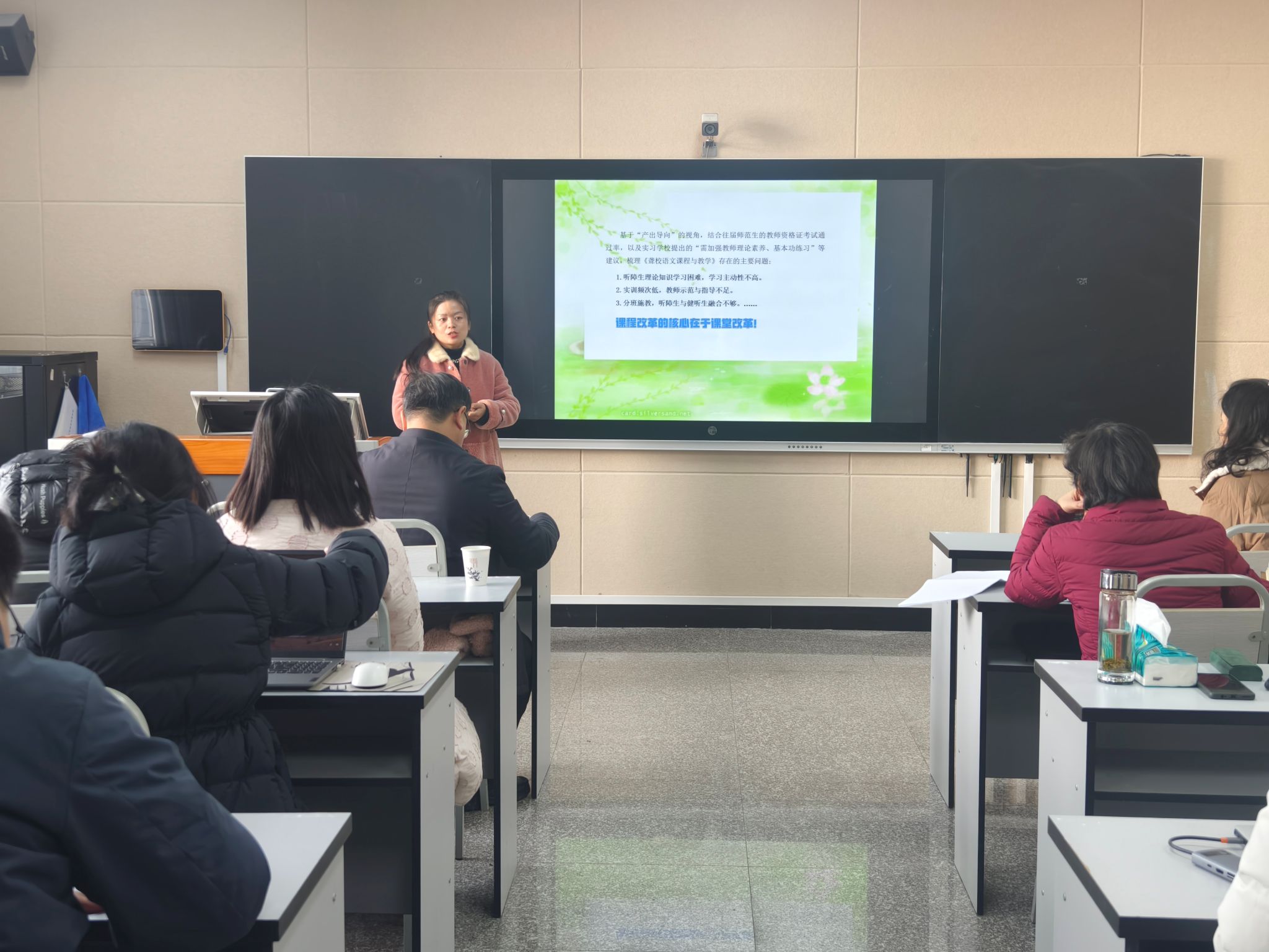刘琴老师作了“以听障生学习为中心的多模态融通课堂教学改革”的主题分享。她以《聋校语文课程教学》课程为例,围绕教学目标和学生需求,对课程内容进行重构与深化,采用“线上学习+课堂精讲+技能实训”线上线下混合式教学模式,精心打造“多模态融通”的生本课堂。她还链接特校语文课堂教学案例和一线教师的教学故事,巧妙渗透思政元素,提高学生主动学习的内生力;尝试普特融合,促进听障生与健听生互学共进,成效显著。