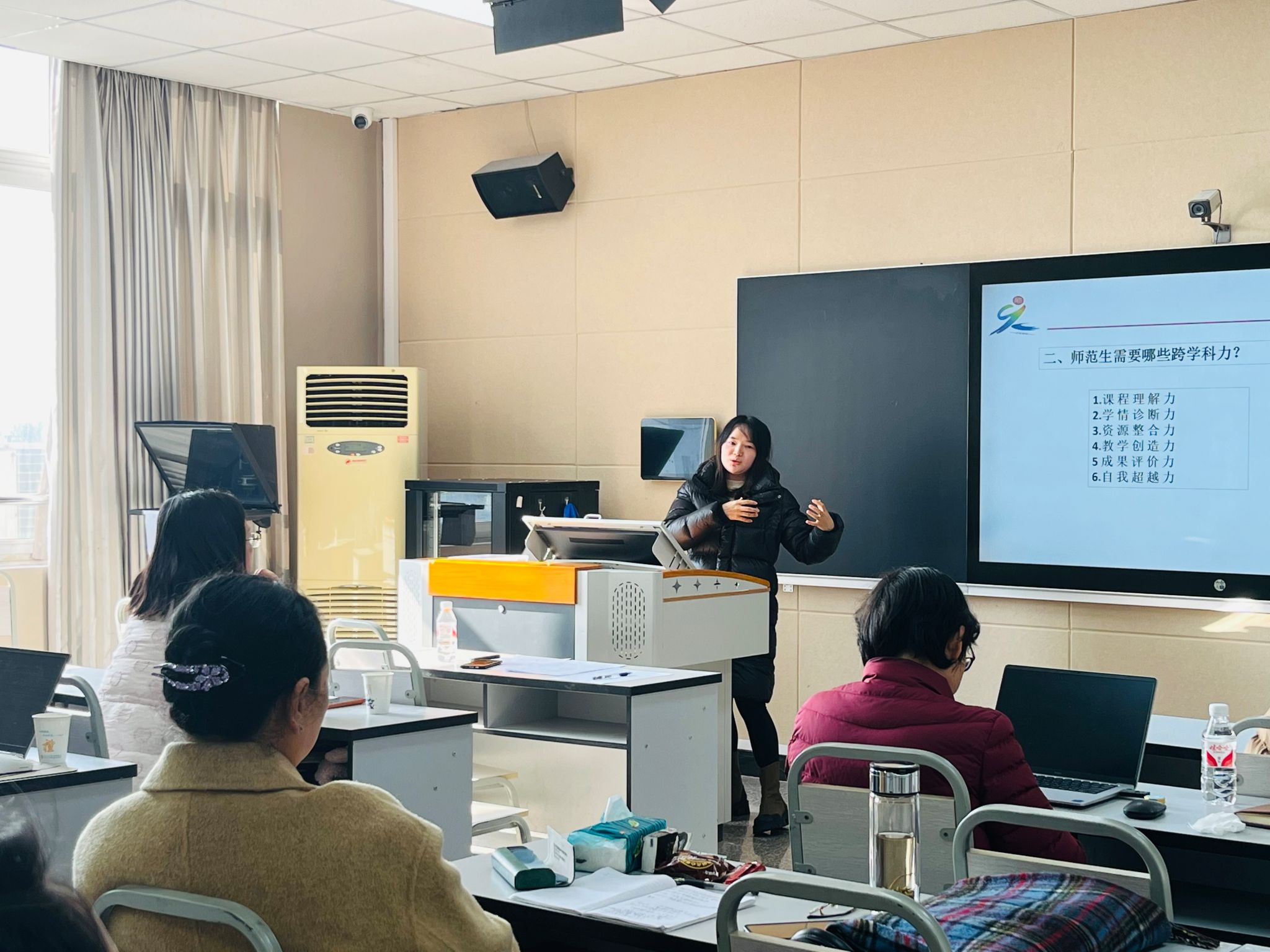 王春燕老师以一个师范生制作的获奖微课片段开启了题为“师范生跨学科力的培养”的主题分享。她从跨学科力的概念、师范生培养跨学科力的意义、如何培养师范生跨学科力三个方面进行了深入探讨。王老师指出,师范生跨学科力包括课程理解力、学情诊断力、资源整合力、教学创造力、成果评价力、自我超越力,并提出了立足学科解决核心问题、落实主体深度参与学习、基于学科主动跨界实践、贴近学情动态反馈引导的四条跨学科力培养的路径。
