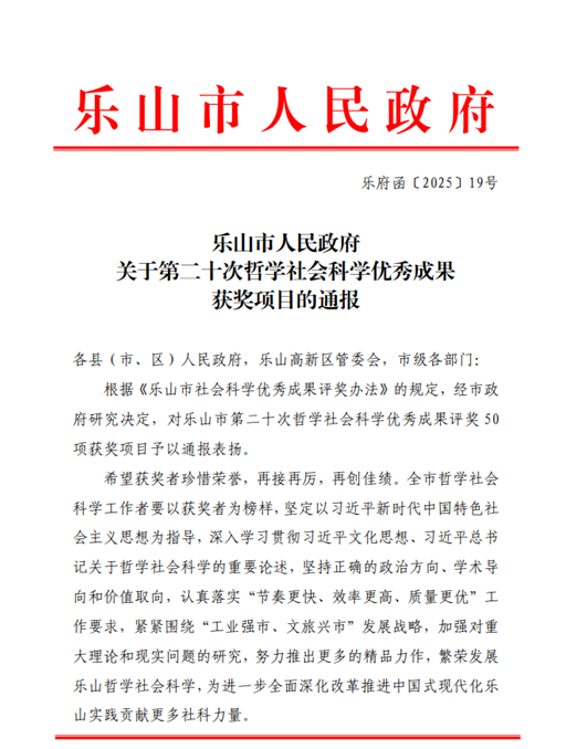 在本次评选中,我院教师的研究成果广泛涉及哲学、社会学等多个学科领域,充分展现了多学科交叉融合的特色与优势。此次评选中我院刘军荣、任文举、刘颖三位老师获一等奖,吴耀国老师获二等奖,牛秀敏、刘军荣、杨小川老师获社科优秀奖。其中,由刘军荣教授团队完成的一等奖成果《乐山参与共建巴蜀文化旅游走廊的路径研究》,以巴蜀文化旅游走廊问题为切入点,为相关领域的学术研究与实践应用提供了重要参考和实践指导。