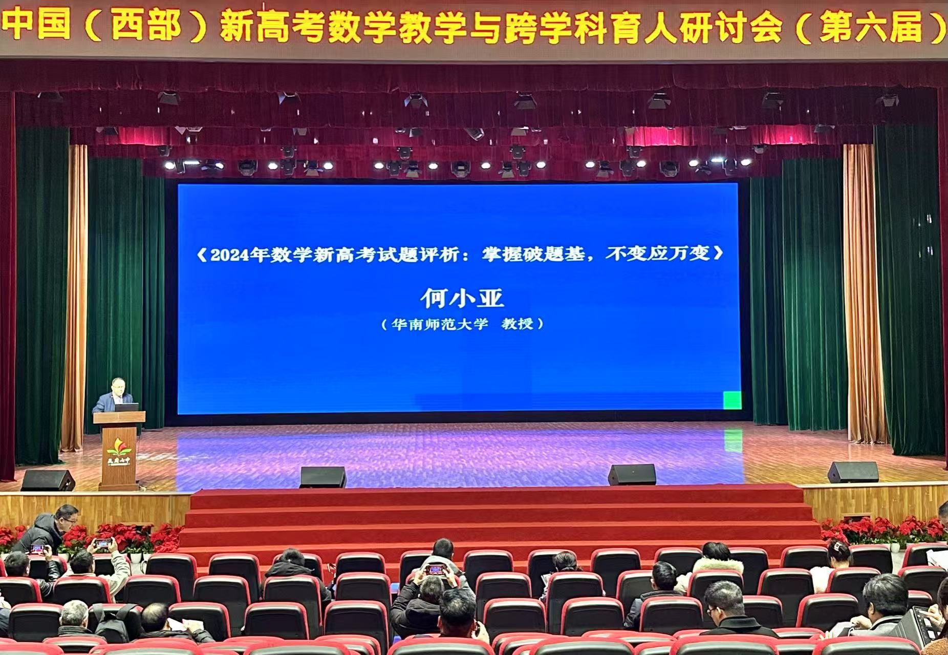 会议围绕新高考数学教学的核心议题,通过专家报告、名师示范课等形式展开深度交流。专家报告兼具理论高度与实践指导意义,为应对数学新高考备考提供了重要参考。北京师范大学保继光教授从政策层面剖析高考改革的底层逻辑,结合案例为教学实践提供方向指引;华南师范大学何小亚教授以2024年新高考试题为切入点,提出“以不变应万变”的备考理念;重庆市教科院熊丙章博士针对高三二轮复习策略,分享了基于实证研究的高效备考方法;中国人民大学附属中学总校副校长周建华教授强调了数学教育与核心素养的深度融合;四川师范大学周思波副教授对高考数学答题规范进行了详细解读;攀枝花三中正高级教师冯蓉波以“概率统计中的递推数列问题”为例展示了新高考对高阶思维的考查视角;会议发起人内江师范学院赵思林教授系统剖析了新高考数学核心素养考查要点和实践策略,为一线教师优化教学、应对改革提供了科学指导。