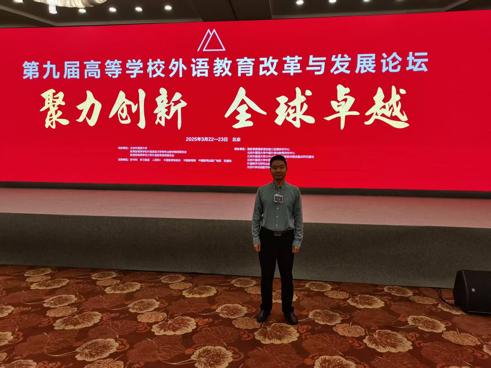 本网讯(文图/徐波 )3月21日至23日,第九届全国高等学校外语教育改革与发展高端论坛在北京隆重举行。本次论坛以"聚力创新 全球卓越"为主题,吸引了来自全国高校外语教育领域的专家学者、教师代表及行业同仁2200余人参会。我校外国语学院徐波教授参会,围绕外语教育数字化转型、智能驱动的高校外语教学生态等前沿议题与参会代表展开深入交流。