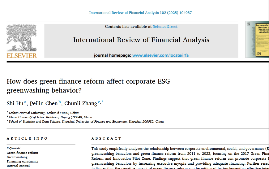 本网讯(文图/黄昀)近日,法学与公共管理学院教师胡实博士(后)在国际知名学术期刊《International Review of Financial Analysis》上发表了一篇重要研究论文《How does green finance reform affect corporate ESGgreenwashingbehavior?》。该期刊系国际金融学领域知名SSCI期刊,属于JCR一区,ABS三星期刊,入选为澳大利亚ABCD评级A类,在商业金融期刊领域排名全球第6位。