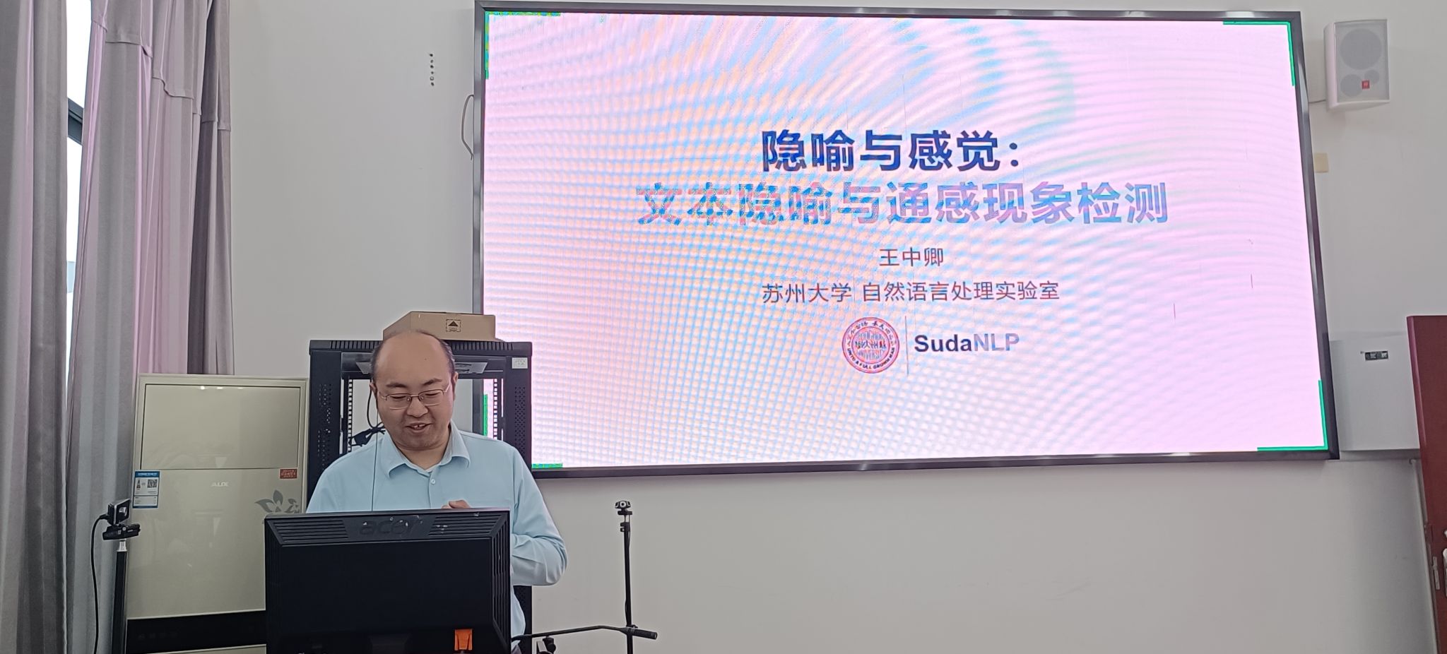 最后,苏州大学计算机科学与技术学院副教授王中卿带来了“结合大语言模型的文本隐喻分析”的报告。王教授在人工智能、自然语言处理等领域成果显著,发表多篇高水平论文并承担多项科研项目。他详细阐述了文本隐喻检测以及通感现象检测的相关研究,从语料库、检测方法到最新研究成果,让师生们对隐喻分析这一复杂而有趣的研究领域有了更深入的理解。
