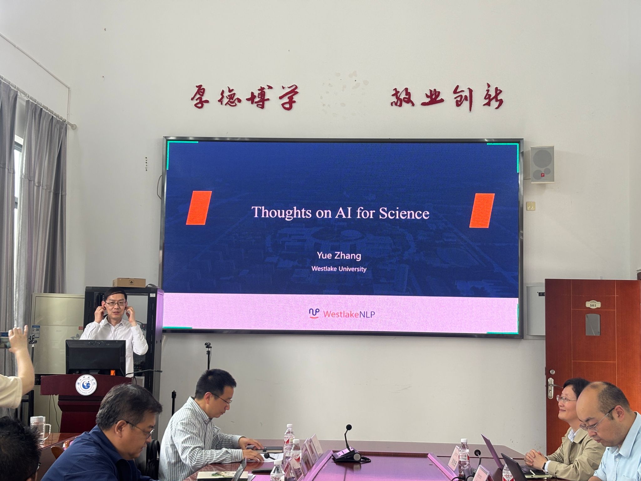 西湖大学教授、工学院副院长张岳率先开讲,讲座题目为“AI科学研究加速—自动的知识整理和写作”。张岳教授学术履历辉煌,2003年于清华大学获得计算机科学本科学位,2009年在牛津大学斩获计算机科学博士学位,并在剑桥大学完成博士后研究工作。他在自然语言处理等领域成果丰硕,著作及担任编委、获奖经历不胜枚举。在报告中,张岳教授分享了实验室在文献调研和论文撰写方面的前沿工作,展示了AI如何全方位助力科学研究效率提升,从智能推荐文章到自动撰写综述,再到全流程的论文创作及修改,为师生们打开了全新的科研视角。