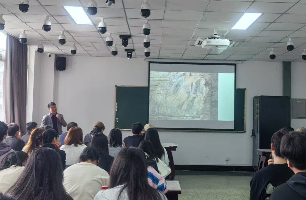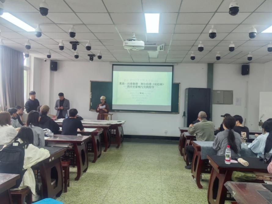 本网讯(文图/王小波)4月11日,美术与设计学院特邀北京工业大学艺术设计学院高远博士来校开展题为“阿尔伯蒂《论绘画》的历史影响及实践指导”的专题讲座。美术与设计学院党委书记王孝琴、院长熊火花、国画教研室主任高斌、书法教研室主任刘善军、教材教法老师王小波及部分教师与2023级美术学、书法学全体学生参加此次讲座。讲座由熊火花主持。