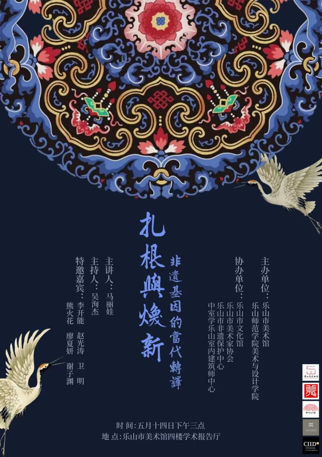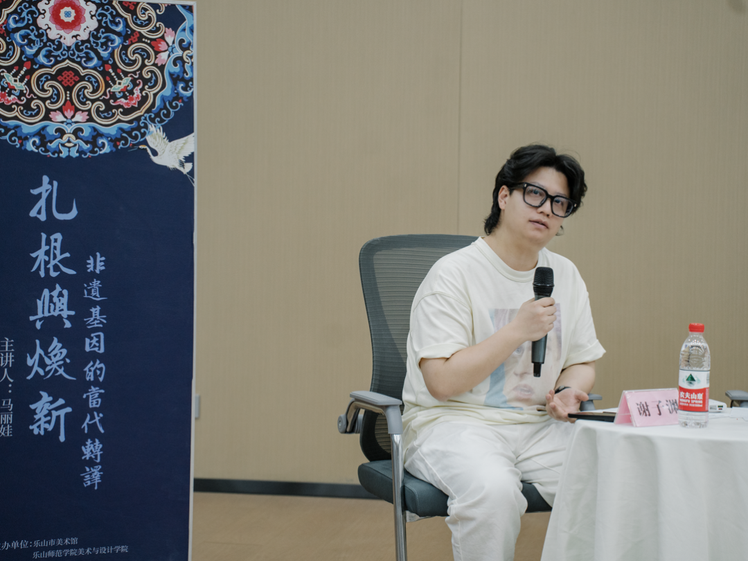 本次讲座特邀成都大学美术与设计学院数字艺术与时尚创意产业学院副院长马丽娃担任主讲嘉宾。同时邀请到乐山市美术家协会主席李开能,乐山市文化馆馆长、乐山市非遗保护中心主任赵光涛,乐山师范学院美术与设计学院院长熊火花,乐山市文化馆副馆长卫明,四川省省级非物质文化遗产峨眉扎染代表性传承人、乐山师范学院副教授、产品设计专业负责人王永清,博士后、乐山市美术馆公教部专家顾问廖夏妍教授,数字媒体博士后、乐山师范学院美术与设计学院数字媒体专业教师曹鹏,中室学乐山室内建筑师中心副主任谢子渊等一众专家学者,共同带来题为《扎根与焕新:非遗基因的当代转译》的学术交流会。学术交流会由乐山市美术馆党支部书记吴洵杰主持。此次交流会吸引了近百名艺术爱好者及学者参与。