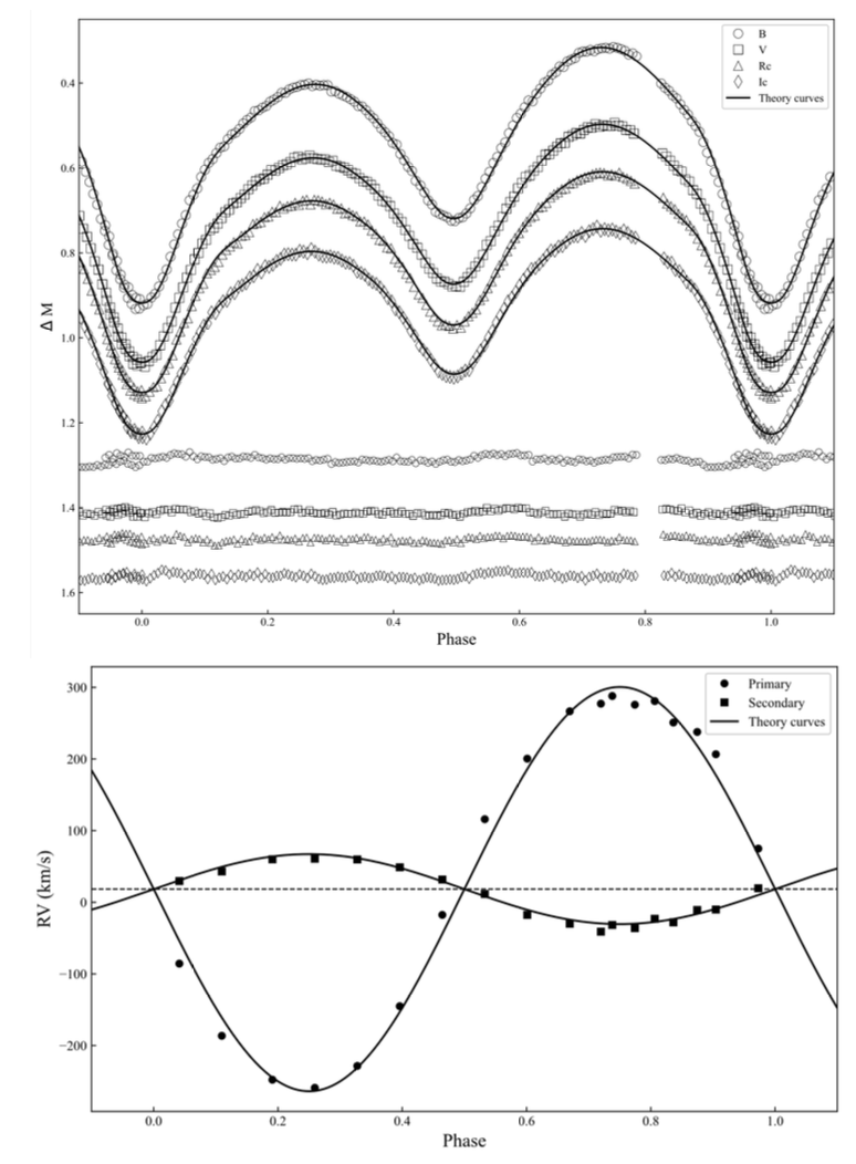 相接双星是宇宙中最常见的一类双星系统,两颗恒星共享公共包层,演化过程极为复杂,是恒星演化与磁活动研究中的重要前沿课题。本研究基于TESS空间望远镜和中国科学院国家天文台兴隆观测站观测获得的多波段光变曲线与视向速度曲线,通过联合建模,首次确认了变星NR Cam是一颗活跃的小质量比中度相接双星系统,主星质量约为0.16倍太阳质量,次星质量约为0.94倍太阳质量。该研究修正了Tavakkoli等人仅依赖光变曲线得出“NR Cam为大质量比浅度相接双星”的结论,首次准确获得了该系统的轨道和物理参数。