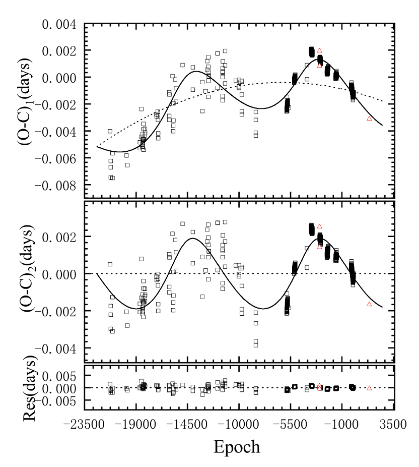 进一步的轨道周期变化分析表明,NR Cam的轨道周期在长期缩短的趋势上叠加了一个振幅约0.0019天、周期约7.8年的周期性振荡。这类周期性变化通常可由光时效应或恒星周期性磁活动引起。结合前人关于相接双星第三体普遍存在的统计结果,研究推测该周期性变化更可能由第三伴星引发的光时效应造成。模型计算显示,该第三伴星的最小质量约为0.096倍太阳质量,其最大轨道半长轴约为3.84天文单位。这一结果意味着NR Cam很可能是一个层级三级系统,为研究相接双星的多体引力作用及长期演化提供了新的观测证据。