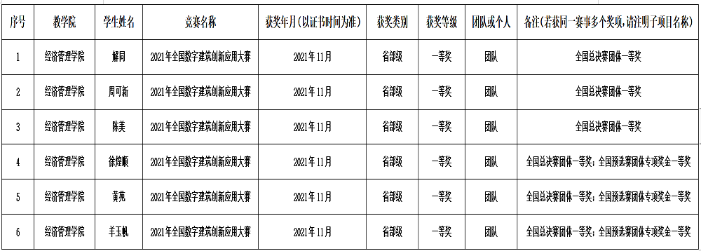 本网讯(文/董欣)11月6日,在2021年全国数字建筑创新应用大赛中,经济管理学院派出三支队伍参赛,由学院教师石江波带领指导,其中2018级工程造价一班解同、周可新、陈美获得全国总决赛团体一等奖,2018级工程造价一班徐煌顺、工程造价二班黄苑、羊玉帆获得全国总决赛团体一等奖和全国预选赛团体专项奖金一等奖。