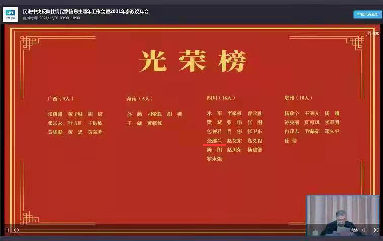 本网讯(文、图/黄渝婷 周绍炳)2021年12月1日,民进乐山师院总支以视频的形式参加了民进中央反映社情民意信息主题年工作会暨2021年参政议政的视频会议。会上,我校马克思主义学院教授、民进总支主委张继兰获“民进全国反映社情民意信息工作先进个人”称号,受到民进中央委员会表彰。
