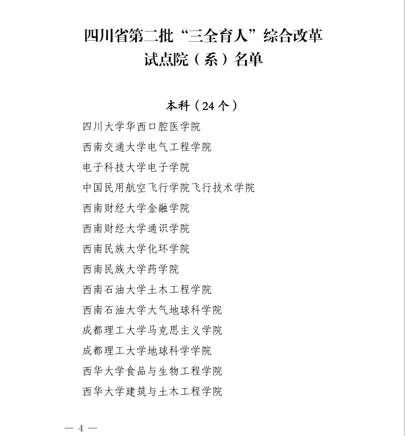 据悉,四川省第二批“三全育人”综合改革试点院(系)有乐山师范学院外国语学院、四川大学华西口腔医学院、电子科技大学电子学院等24个本科院系。