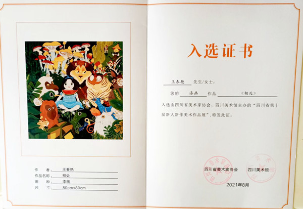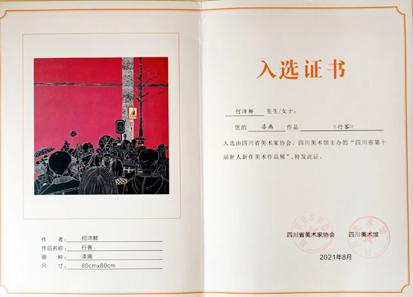 本网讯(文、图/颜伟娜)近日,2021年“四川省第十届新人新作美术作品展”传来喜讯。由我校设计学院颜伟娜老师指导,18级产品设计1班何沛鲜的漆画《行客》、19级产品设计2班王春艳的漆画《相处》2幅作品入选该展。本次展览以公开征集的形式,收到来自全省美术创作者的参评作品1775件,经过严格评审,最终评选出入选作品149件,其中优秀作品53件,画种包括中国画、油画、版画、雕塑、漆画、水彩水粉、综合材料画等。我校学生能从众多专业选手中脱颖而出,实属不易。