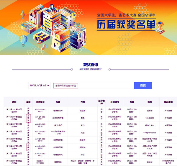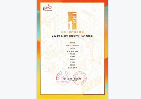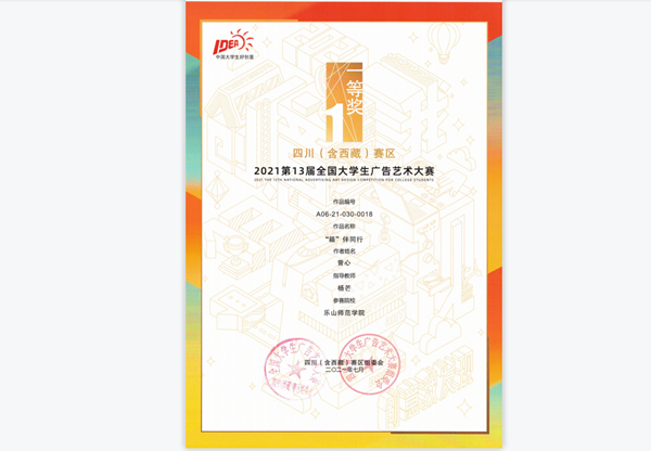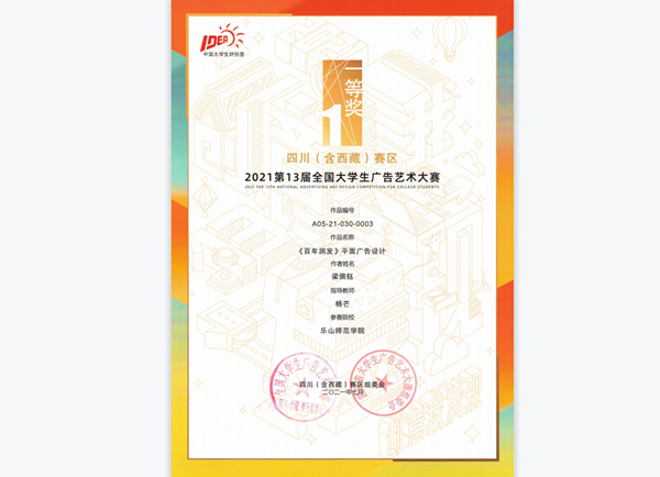 这是设计学院成立以来第二次参加此次大赛,我校设计学院共123件作品参加了比赛,其中32件作品进入全国赛区参加了决赛,最终全国赛区荣获三等奖2个,优秀奖4个,这是近年来,设计学院(包括原美术学院和计算机学院)获得大广赛全国等级奖项历届最好成绩。四川(西藏)赛区,我院获得一等奖3个,二等奖5个,三等奖25个,优秀奖9个的优异成绩。其中,杨芒、王进修二位老师荣获四川赛区优秀指导老师。