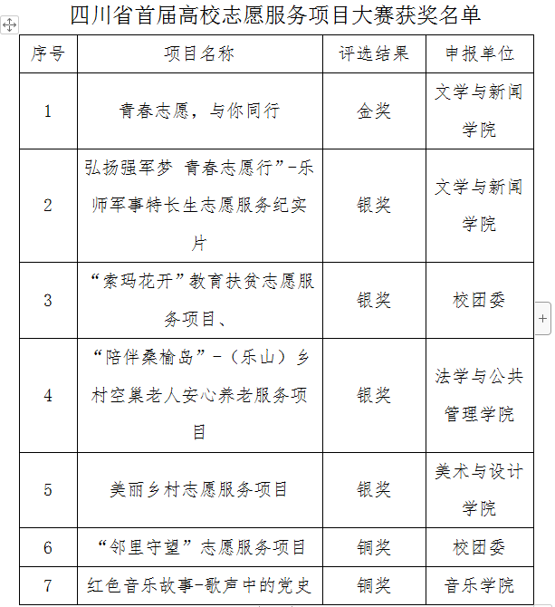 本次比赛由校团委牵头,前期在各学院进行了大量的宣传动员,全校共有57个项目参加校内选拔,经过校内外专家评审,最后推荐了15个项目参加省上的决赛。为力争获得好成绩,李朝晖副校长多次对推报项目进行指导,校团委也牵头对推报项目的介绍、成效、创新等方面进行一一打磨。功夫不负有心人,终评时我校获得1金4银2铜的好成绩,其中文化产品设计类赛道广播“青春志愿,与你同行”斩获金奖,视频“弘扬强军梦 青春志愿行”-乐师军事特长生志愿服务纪实片、“索玛花开”教育扶贫志愿服务项目、美丽乡村志愿服务项目、“陪伴桑榆岛”-(乐山)乡村空巢老人安心养老服务项目获银奖,“邻里守望”志愿服务项目、红色音乐故事-歌声中的党史获评铜奖。此次大赛从获奖质量和数量来看,我校位列同类院校第一,既充分展示了我校志愿服务项目的成效,也为下一步继续打造精品志愿服务项目打下坚实基础。