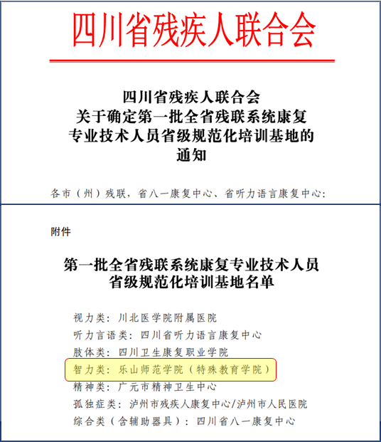 本网讯(文/李燕、刘宗泉 图/刘宗泉) 近日,四川省残疾人联合会发布了《关于确定第一批全省残联系统康复专业技术人员省级规范化培训基地的通知》,我校获批“四川省残联系统康复专业技术人员(智力类)省级规范化培训基地”。这是我校成立康复学院以来,特殊教育学院、康复学院全体教职工紧扣“特殊儿童康复”相关学科内涵,对标竞进,大力推进学院现有教育康复学专业和课程内涵建设,提升特殊儿童教育康复人才培养质量,夯实接下来申报与“特殊儿童康复”相关新专业基础的最新成果。
