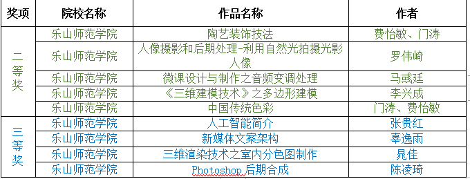 本网讯(文图/门涛)6月10日,从全国数字创意教学技能大赛组委会传来消息,第五届全国数字创意教学技能大赛(普通高等院校赛道)成绩发布,乐山师范学院取得优异成绩,共有9个微课作品获奖,其中二等奖5项,三等奖4项,美术与设计学院获奖8项。这是美术与设计学院在学校领导及教学部的领导下,充分发挥数字媒体技术教研室微课制作技术特长,潜心钻研现代信息技术并应用于教学实践的显性成果;获奖教师中除一位教授外,全部是讲师、助教职称,也是我学院潜心培养青年教师,促进青年教师教学能力的综合体现。