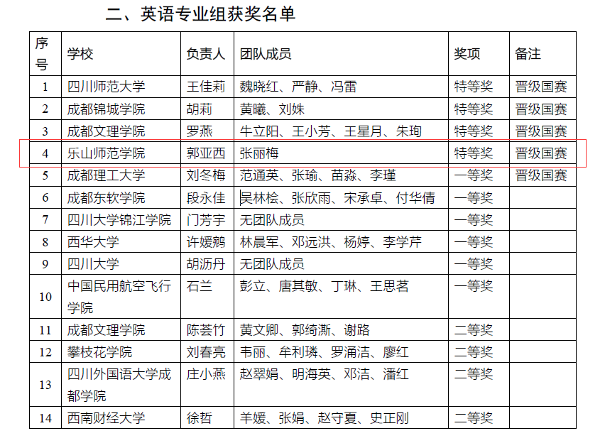 本网讯(文、图/郭亚西 徐波 )10月18日,四川省普通本科高校外国语言文学类专业教学指导委员会公布了2022 年四川省“高教社杯”普通本科高校外语课程思政教学比赛复赛英语专业组获奖名单,外国语学院参赛教师郭亚西及教学团队荣获特等奖,顺利晋级国赛。同时,乐山师范学院荣获优秀组织奖。
