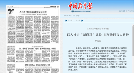 本网讯(文/敬雨霏)10月17日,乐山师范学院经济管理学院副院长罗富民所撰写的《深入推进“新商科”建设 拓展协同育人途径》一文被报道于《中国教育报》第七版。