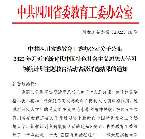 本网讯(文、图/赖伟)四川省教育工委传来最新消息:由我校马克思主义学院赖伟、钟永淑两位教师共同指导的微电影作品《深山铸“剑”壮国威:中国核潜艇“垦荒牛”彭士禄》,荣获2022年四川高校大学生“我心中的思政课”微电影大赛省级一等奖。该成绩居于同类院校前列。