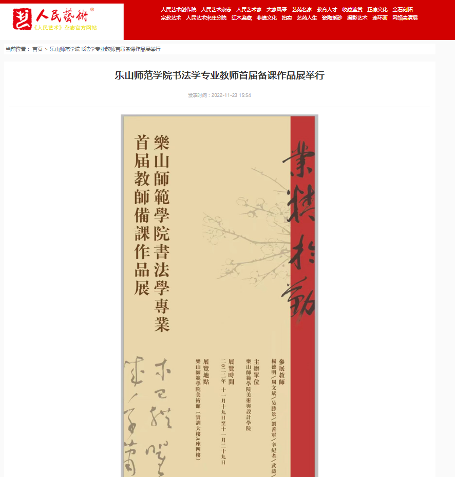 本网讯(文/刘善军)“业精于勤——乐山师范学院书法学专业首届教师备课作品展”自2022年11月19日开展以来,引起了高校书法学专业师生和社会各界人士的高度关注,西南大学书法研究所所长博士生导师曹建说:“备课展可以规范书法教师的书写习惯、教学行为,让学生受到传统的书法教育,值得在所有书法专业推行”;四川省社科院艺术研究中心主任唐林认为,本次备课展体现了书法教育教案是核心,体现了老师们的情怀和对学生的责任。艺术评论家、四川省评论家协会理事胥勋池发表名为“半半观展之《乐山师院书法专业教师首届备课作品展》——守正拓新正践行”评论文章,文章中指出书法教育是书法作为民族艺术在继承和传扬中得以行稳致远的事业,《乐山师院书法学专业教师首届备课作品展》守教育之正、拓方法之新的意义不言而喻。老师们通过备课作品身体力行地告诉学生,守正需要临池功夫、拓新要靠通合能力,而前提是守住书法艺术的民族底线不出格,走文化的传统之道不出轨。